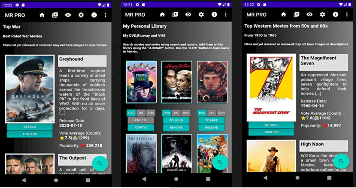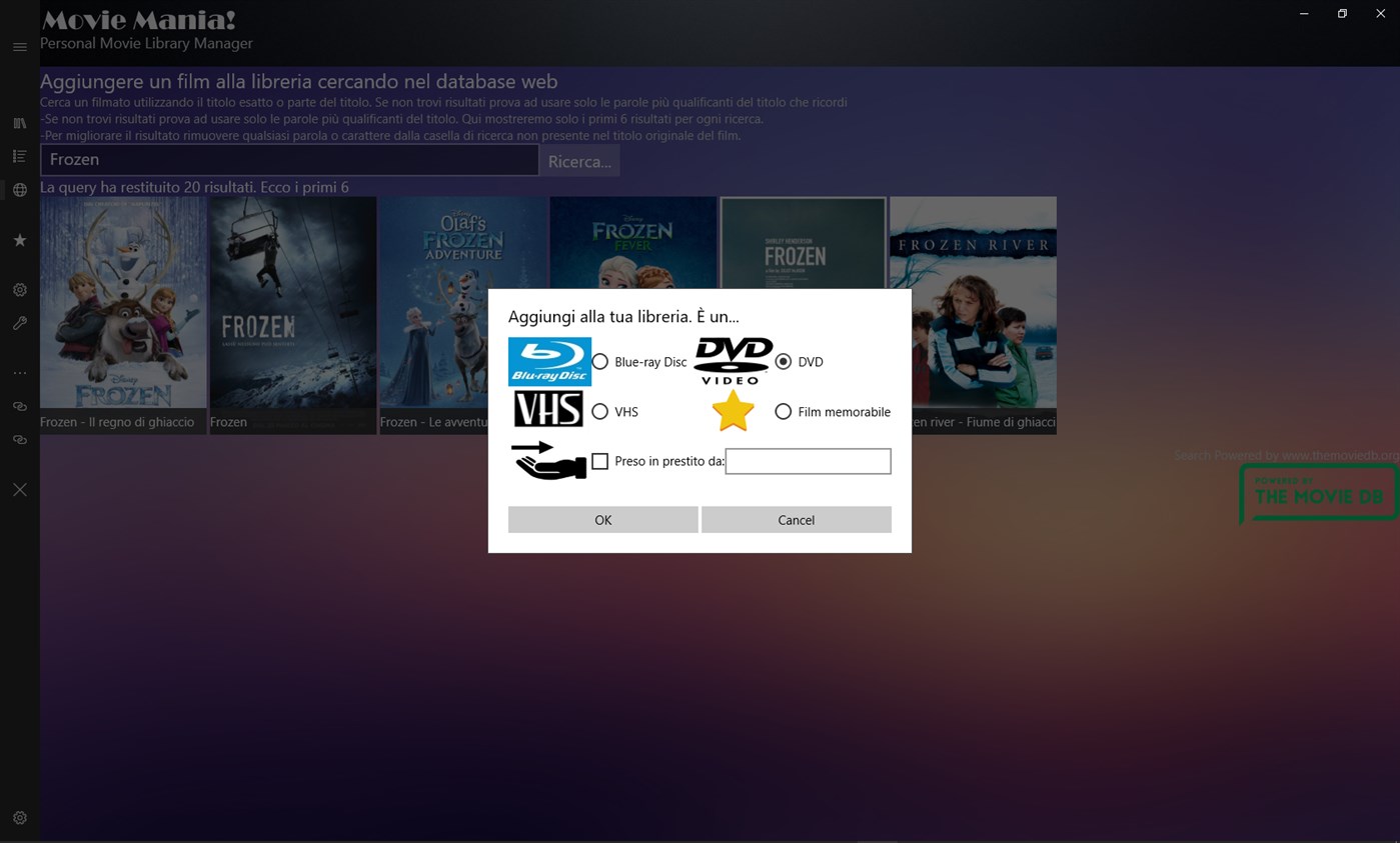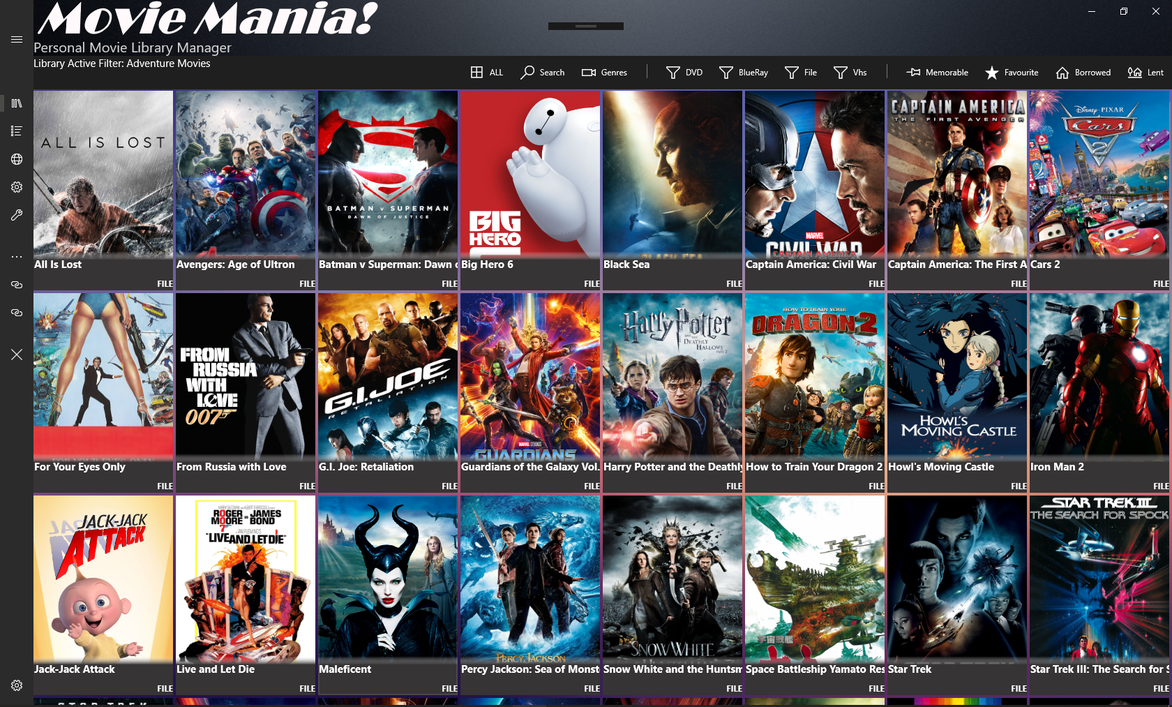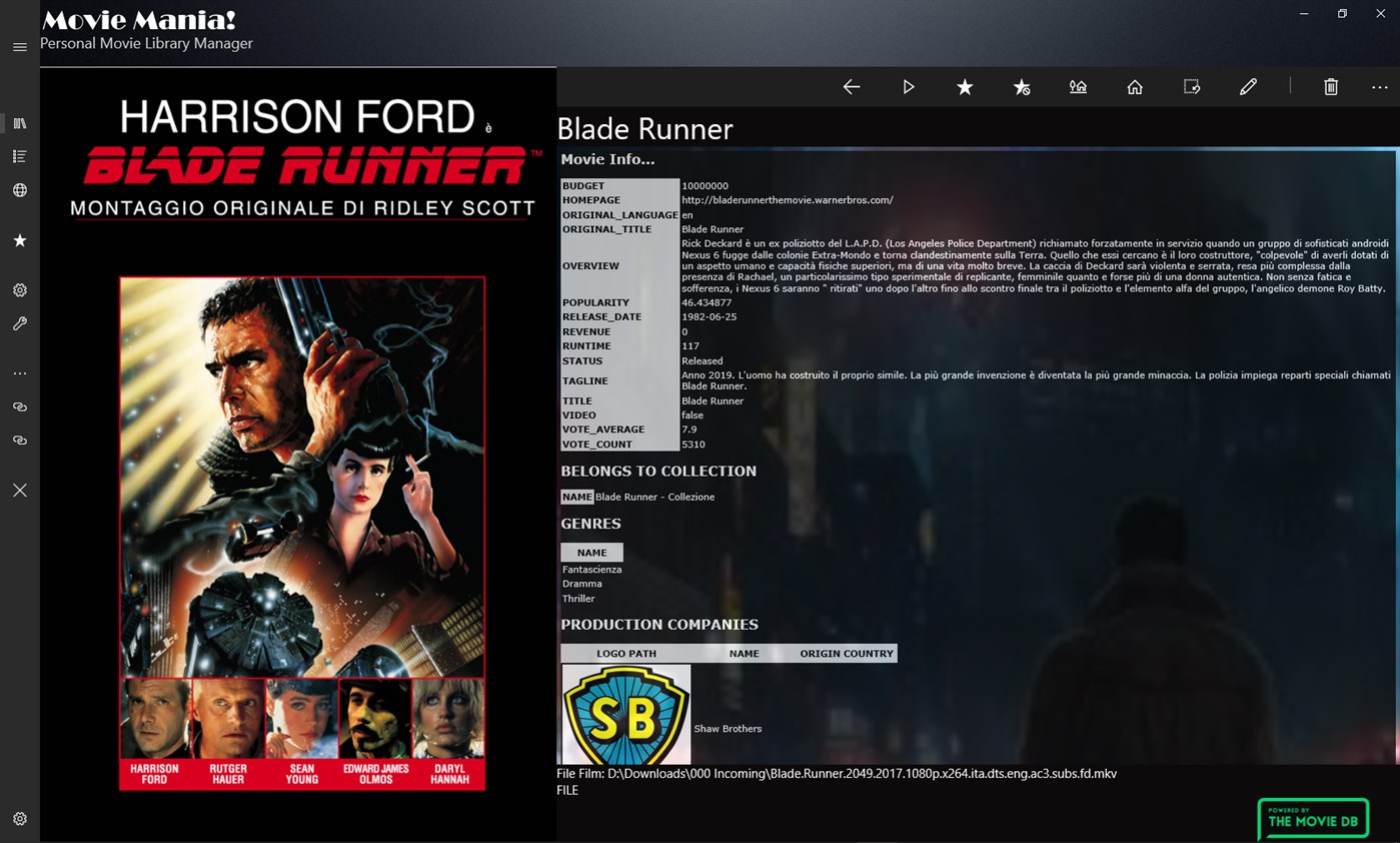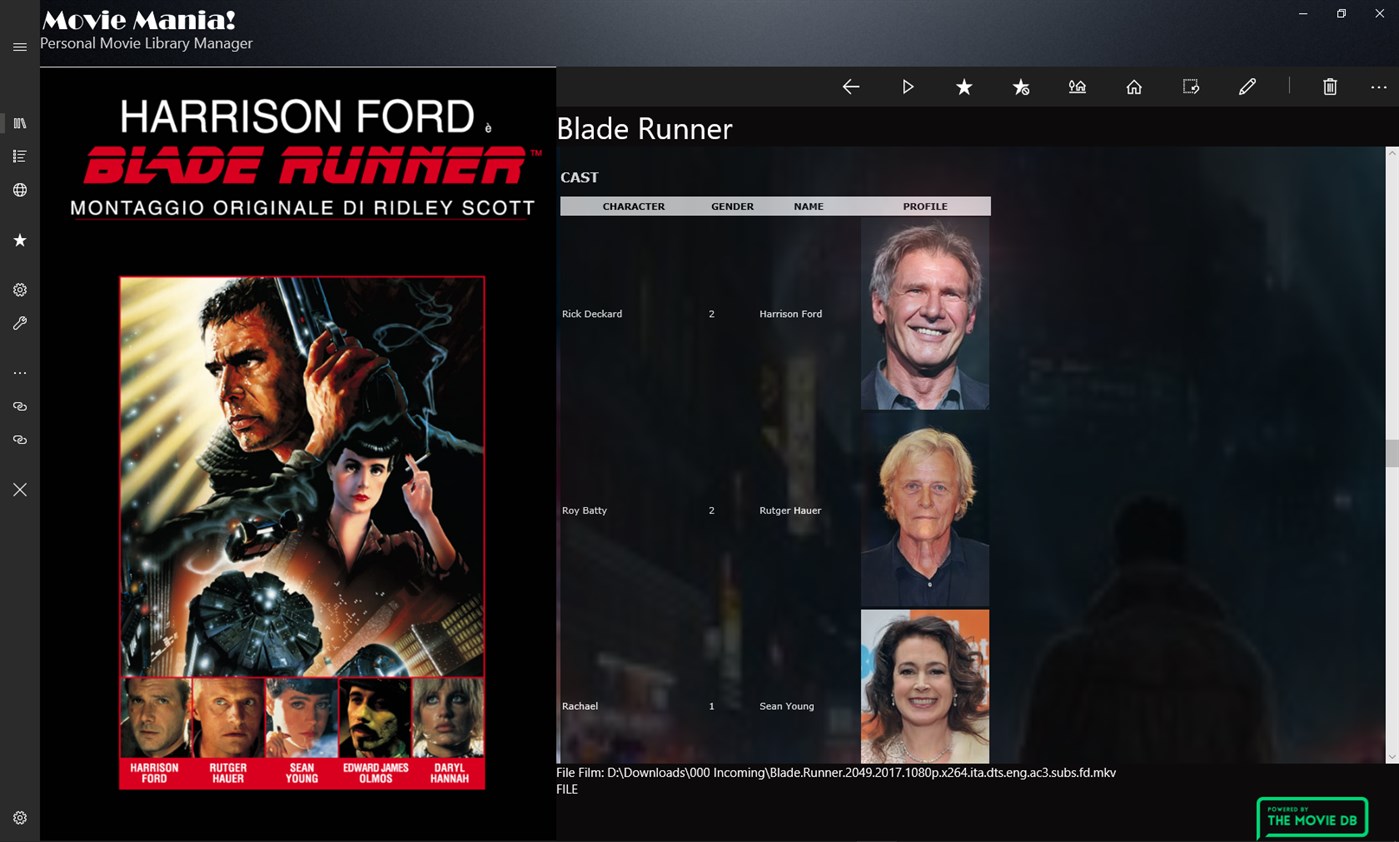 Movie Mania! permetteva di creare e gestire librerie virtuali di film con informazioni scaricate automaticamente dal web: trama, cast, locandine, trailer e molto altro. Potevi scansionare il tuo disco rigido per catalogare i film archiviati, aggiungere supporti fisici (DVD, Blu-ray, VHS) e tenere traccia dei film prestati o in prestito. La versione Android aggiungeva funzionalità social, watchlist e ricerca avanzata.